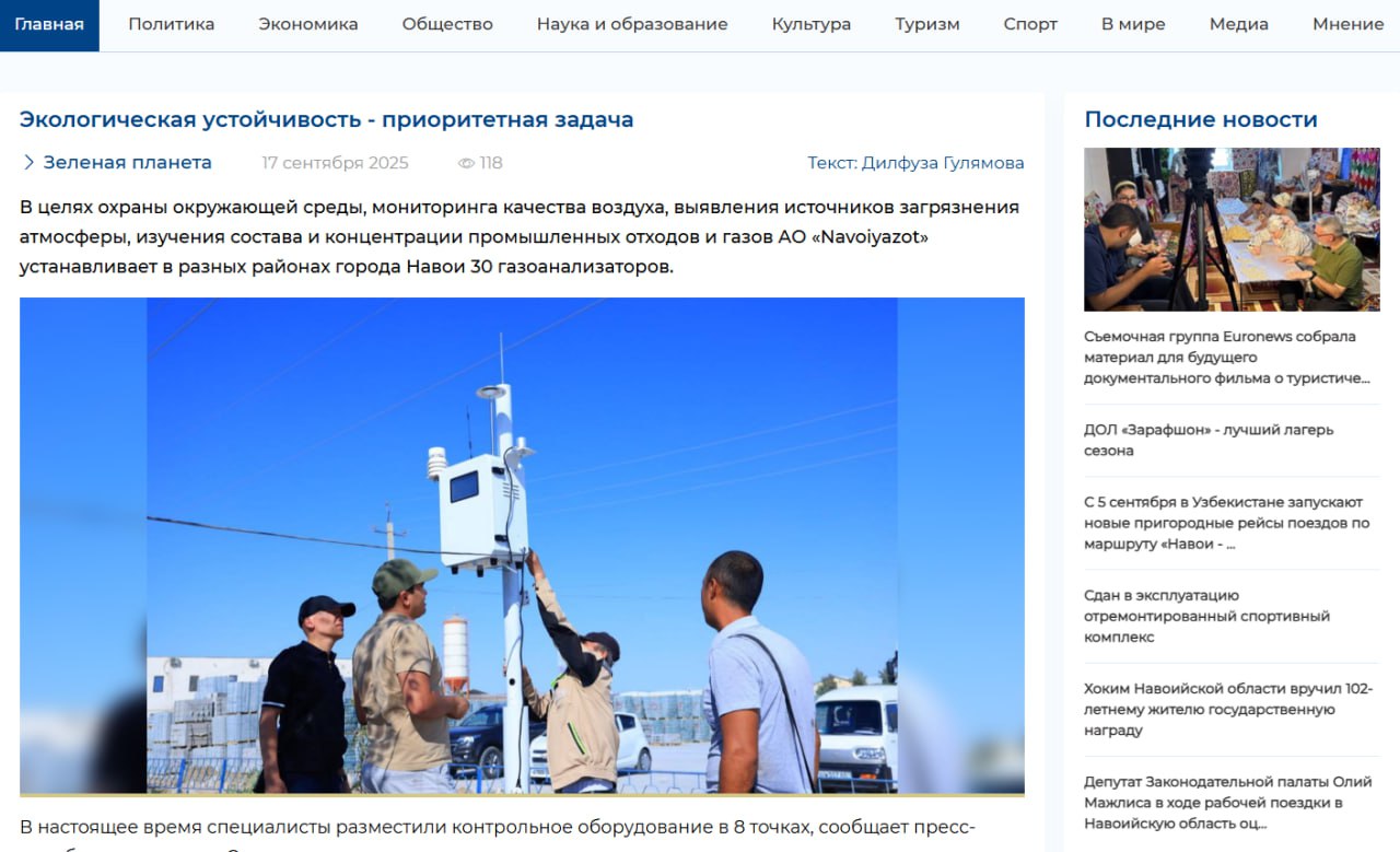 В целях охраны окружающей среды, мониторинга качества воздуха, выявления источников загрязнения атмосферы, изучения состава и концентрации промышленных отходов и газов АО «Navoiyazot» устанавливает в разных районах города Навои 30 газоанализаторов. В настоящее время специалисты разместили контрольное оборудование в 8 точках, сообщает пресс-служба предприятия. С его помощью определяется количество газов в воздухе, их влияние на здоровье человека и источники загрязнения. Это позволит изучить степень соблюдения экологических норм промышленными и производственными предприятиями города Навои и принять практические меры.